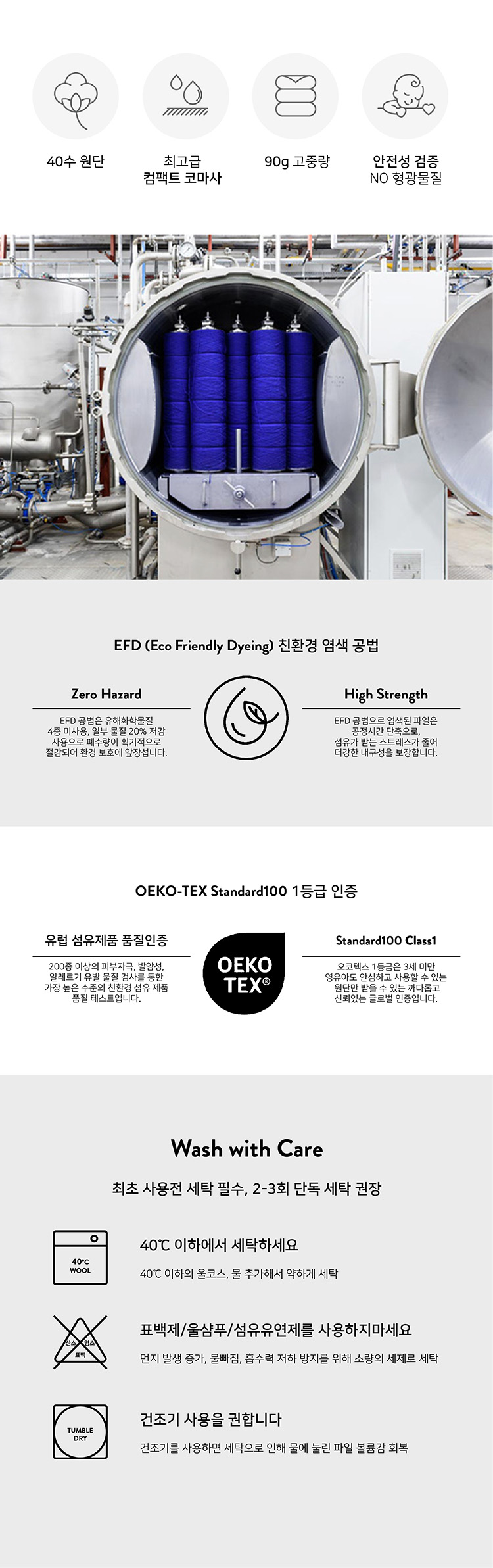 1. 40수 고밀도 코튼의 포근함과 부드러움, 최고급 컴팩트 코마사의 놀라운 흡수력